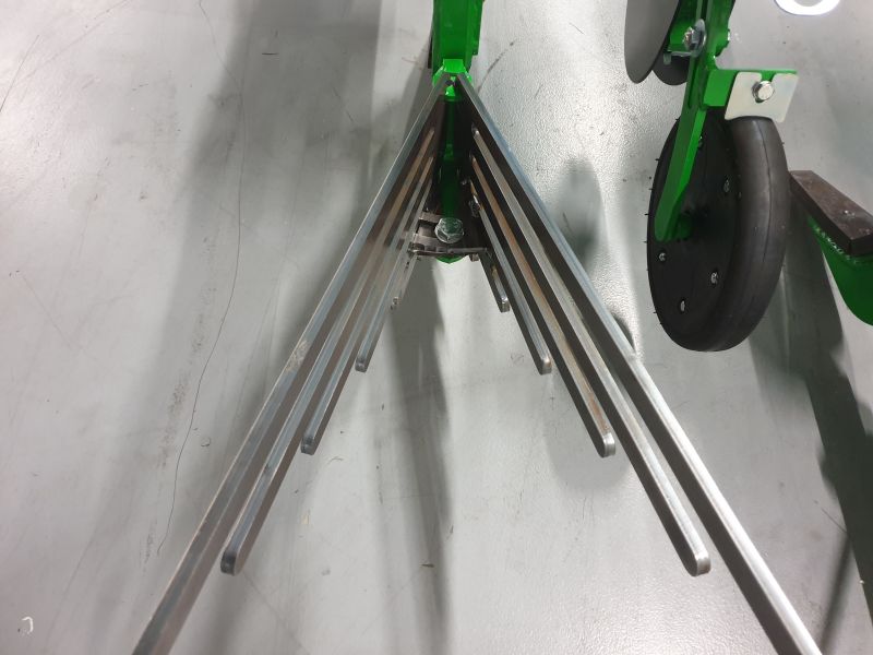 Auf 75er Dämme kann 2-reihig gesät werden. Hierfür haben wir entweder einen Doppel Schleppschar oder einen Doppel Einscheibenschar. Der sä Abstand kann bei beiden eingestellt werden. Beide Schartypen haben einen Dammabräumer. Beim Hacken kann in die Säscharhalterung eine Hackstiel montiert werden, welcher zwischen den Reihen hackt.