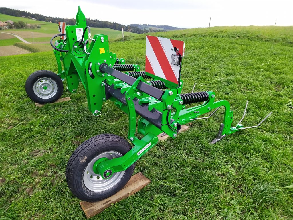 Die Grundmaschine besteht aus einem 3 Punkt Bock für KAT 2. An ihm ist der Trägerbalken für die Scharelemente angeschraubt, dieser kann wahlweise bis 4.5m breit gewählt werden. Weiter ist in dem 3 Punkt Bock die hydraulische Tastradhöhenverstellung integriert. Ein hydraulischer Sperrblock verhindert ein absenken. Die Räder können seitlich verschoben werden. Die Räder sind vor der Maschine angeordnet, damit beim Hacken das ausgezogene Unkraut nicht wieder angedrückt wird und die Erde locker bleibt. Da die Räder ganz aussen laufen, ist die parallelität der Maschine zum Boden sehr gut gegeben, auch wenn die Parzelle nicht eben ist. Integraler Bestandteil des 3 Punkt Bockes ist die Schnellwechsel Aufsatteleinheit für Sämaschinen.