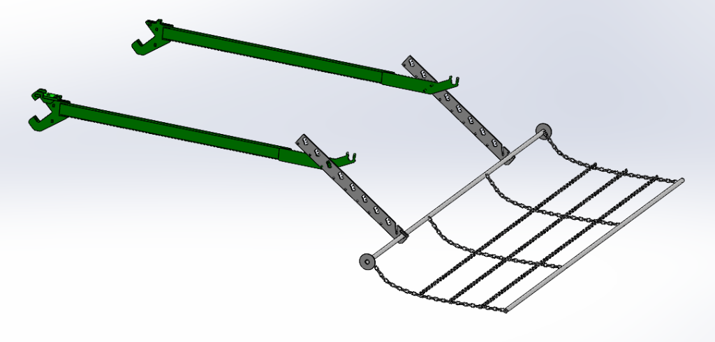 Die Schleppkette kann an beliebiger Stelle montiert werden. Sie wird beim Säen und Hacken im niedrigen Stadium eingesetzt und räumt den Damm von zu grossen Erdschollen ab. Sie ist bewusst nicht all zu schwer ghalten, um die Pflanzen beim Hacken nicht zu beschädigen.